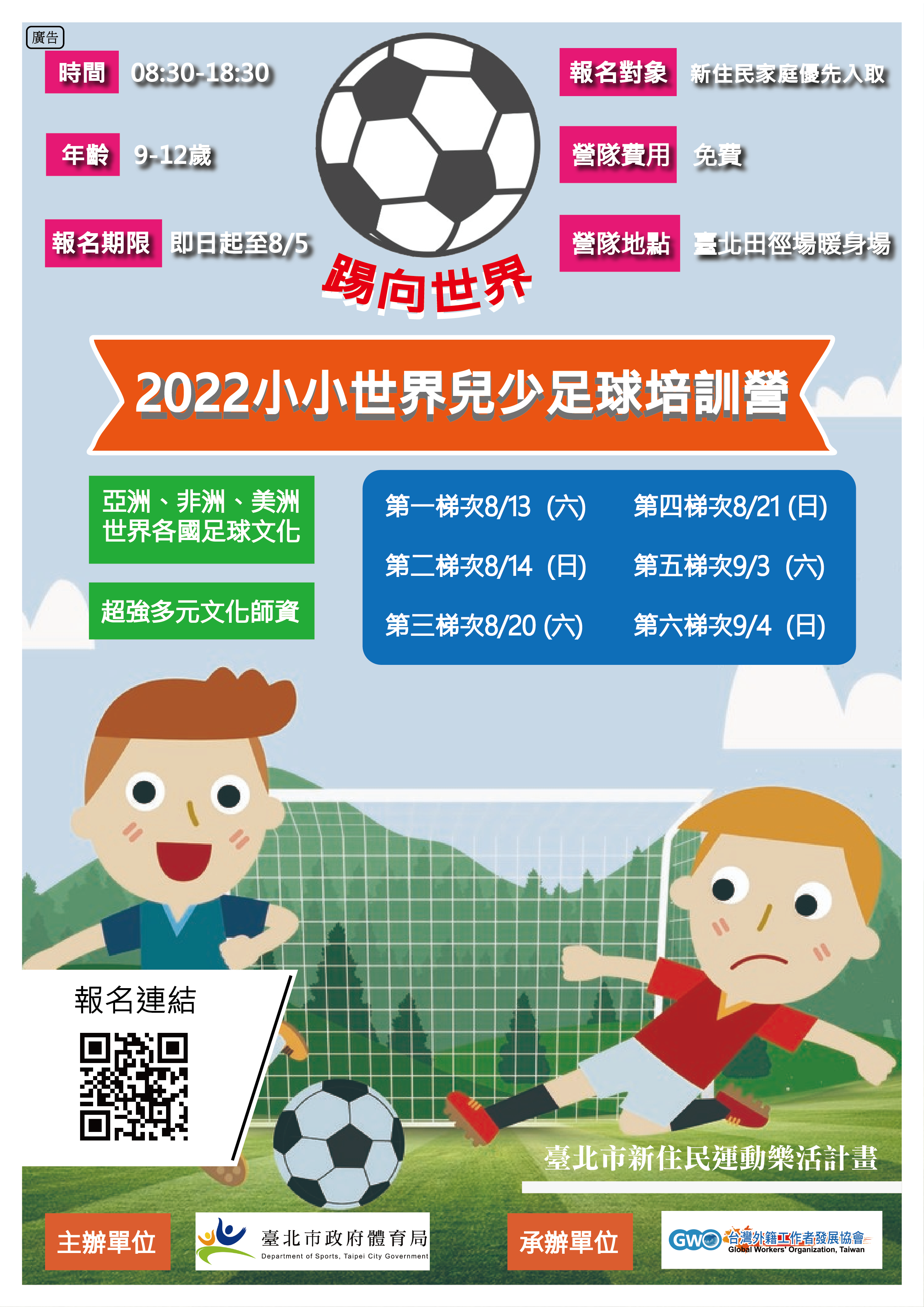 (一)營隊名稱:2022小小世界兒少足球培訓營。