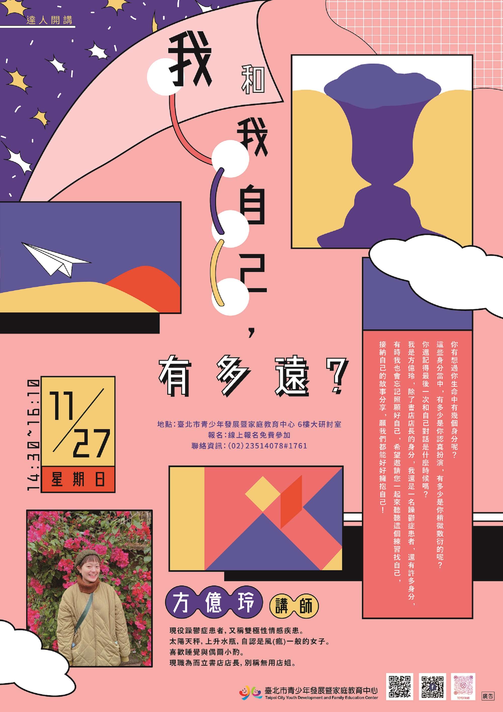 臺北市青少年發展暨家庭教育中心11月27日14:30 舉辦達人開講「我和我自己,有多遠?」,而立書店店長方億玲老師與您分享閱讀的意義,以及過程中的體 驗。活動免費,詳見青發中心官網。