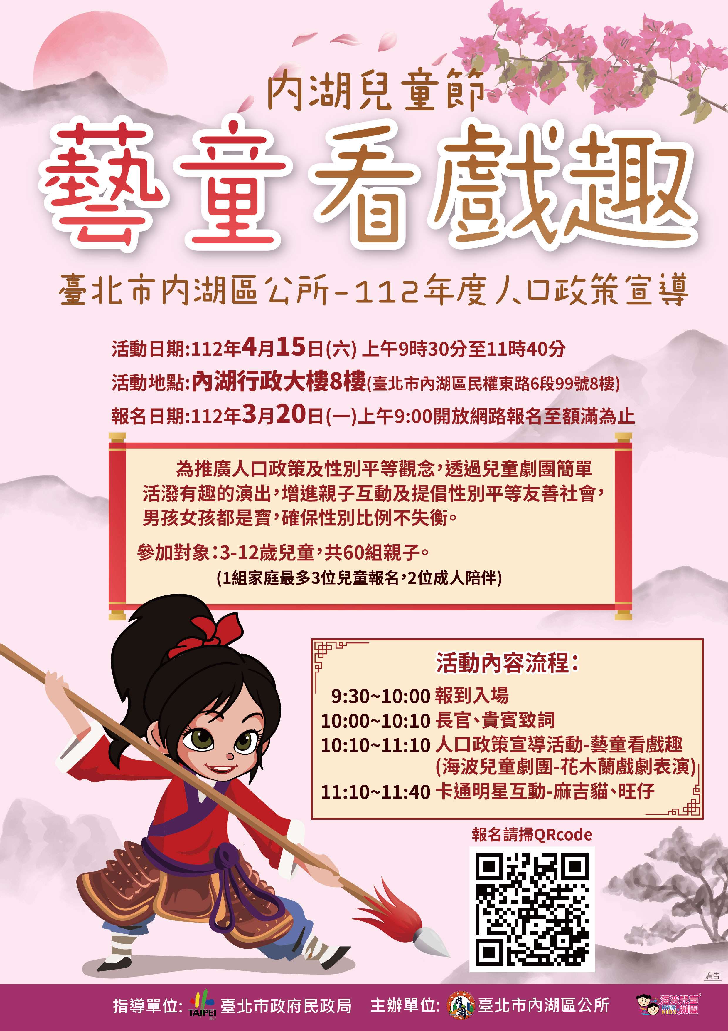 「內湖兒童節-藝童看戲趣」,4月15日舉辦,3月20日開放報名額滿為止,現場有卡通明星互動、古早童玩區讓小朋友好看好玩又有得拿。