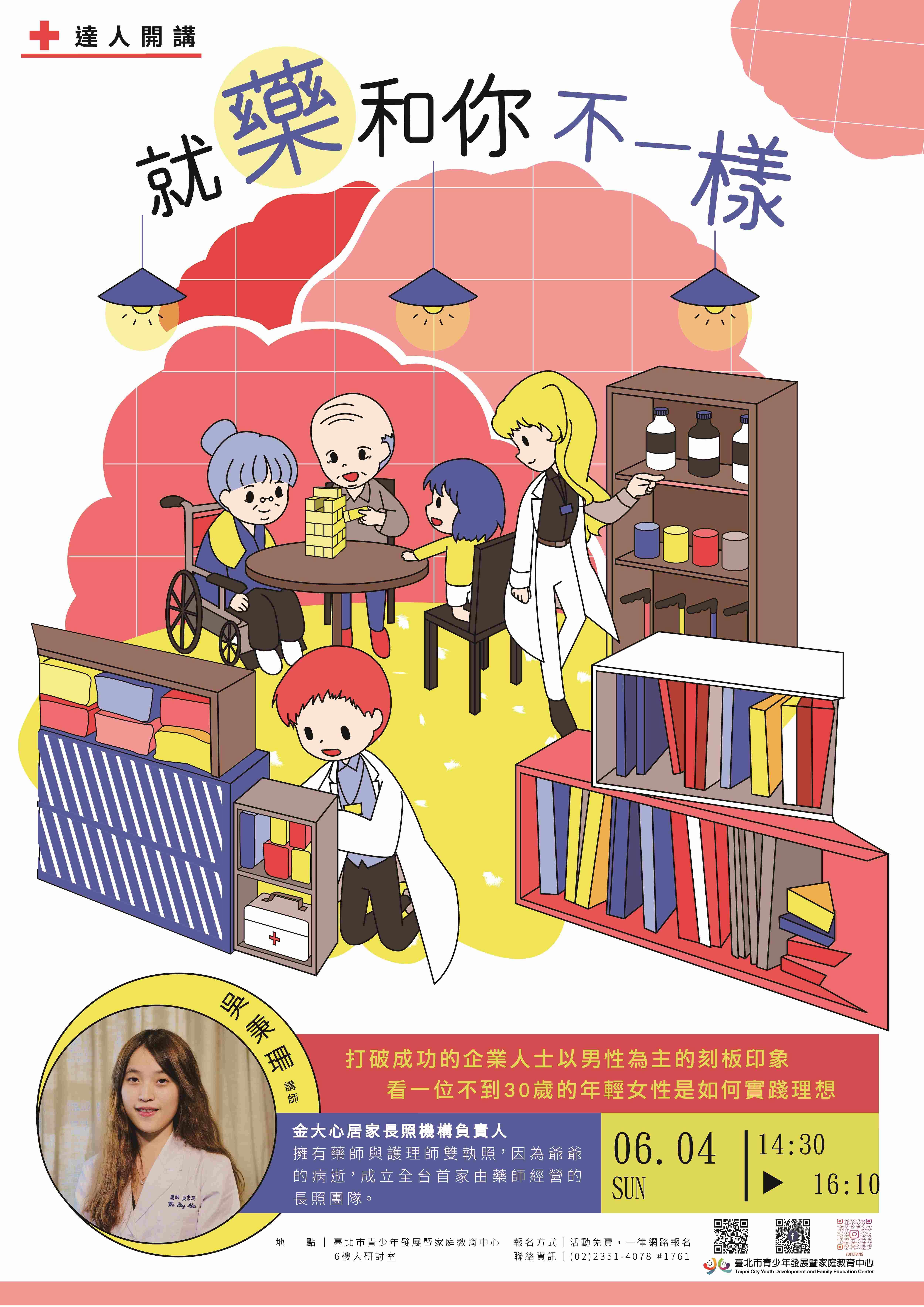 臺北市青少年發展暨家庭教育中心6月4日14:30舉 辦達人開講「就藥和你不一樣」,金大心居家長照機構負責人吳秉珊老師與您分享她經營長照團隊的心路歷 程,以及過程中的體驗。活動免費,詳見青發家教中心官網。