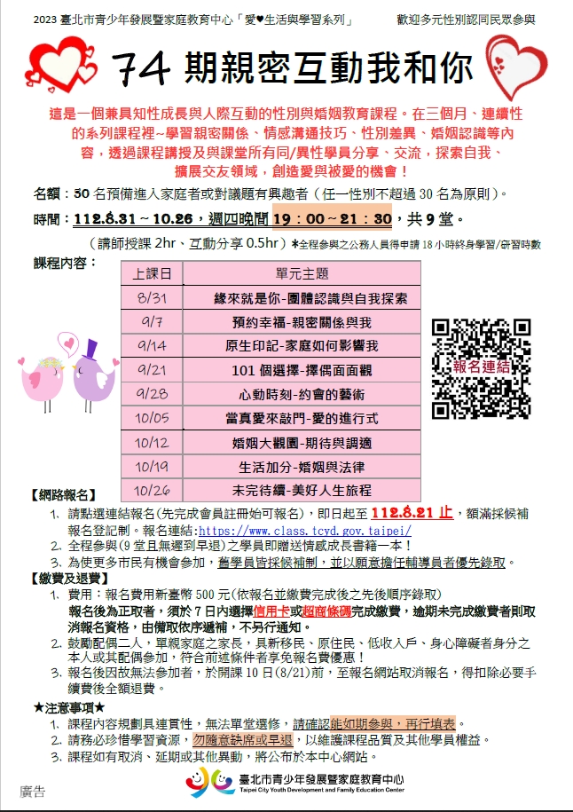 歡迎參加臺北市青少年發展暨家庭教育中心於8至 10月舉辦之「親密互動我和你」情感教育系列課程,內容包含親密關係與我、家庭如何影響我、約會與擇偶、 婚姻與法律等主題,報名請上網或洽2351-4078轉 1614。