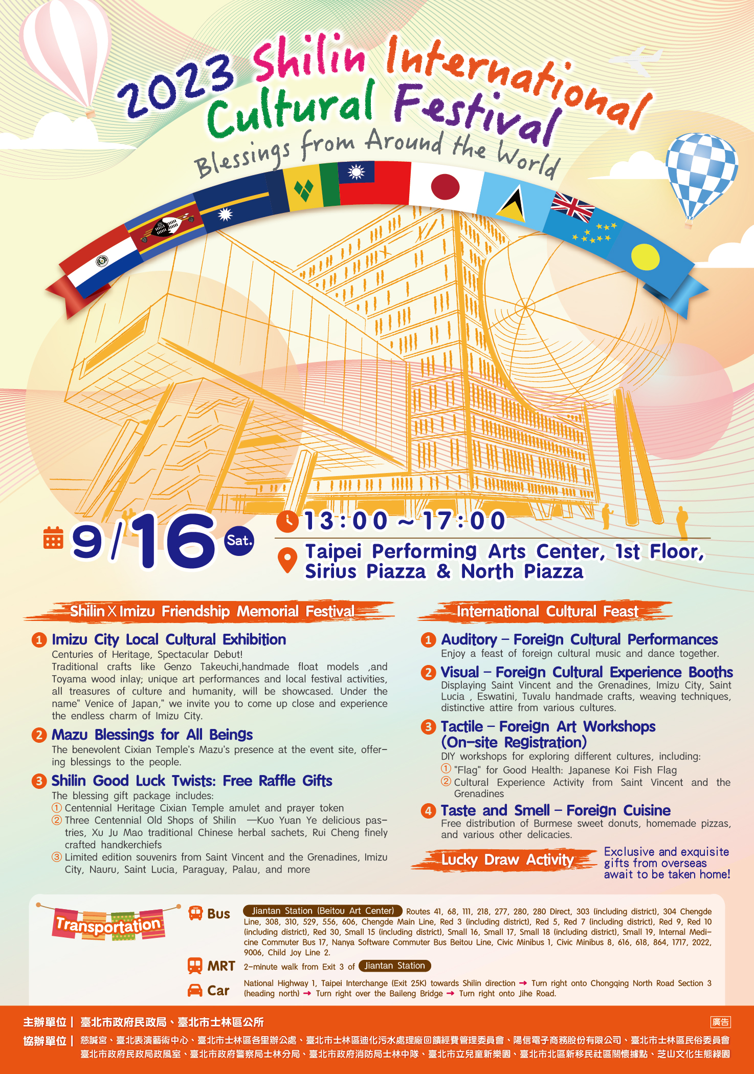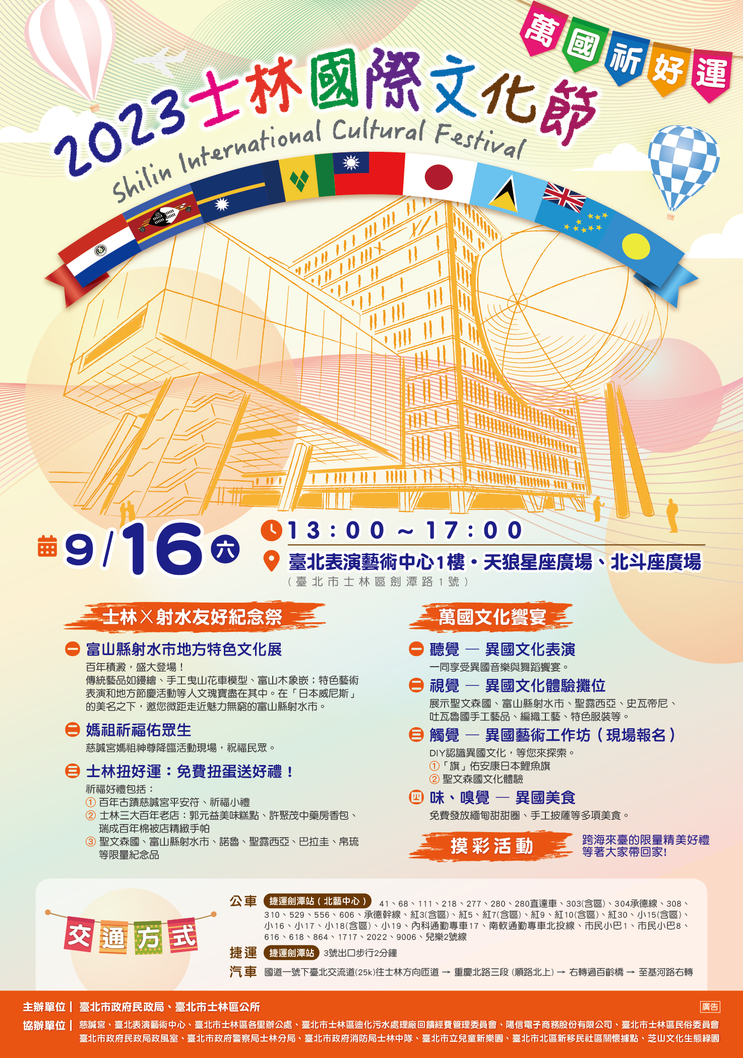 2023士林國際文化節於9/16(六)13:00-17:00舉辦,地點在北藝中心,歡迎有興趣參與的家長參加!