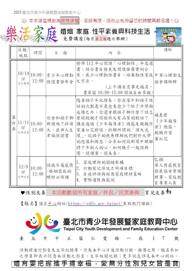 青發家教中心免費講座:10/14青少年心理韌性選書發布會暨書展、11/11你會和孩子聊新聞嗎?拚頂大並非人生幸福保證書、12/9談錢不傷感情-婚姻家庭的理財必修課,歡迎上網查詢。