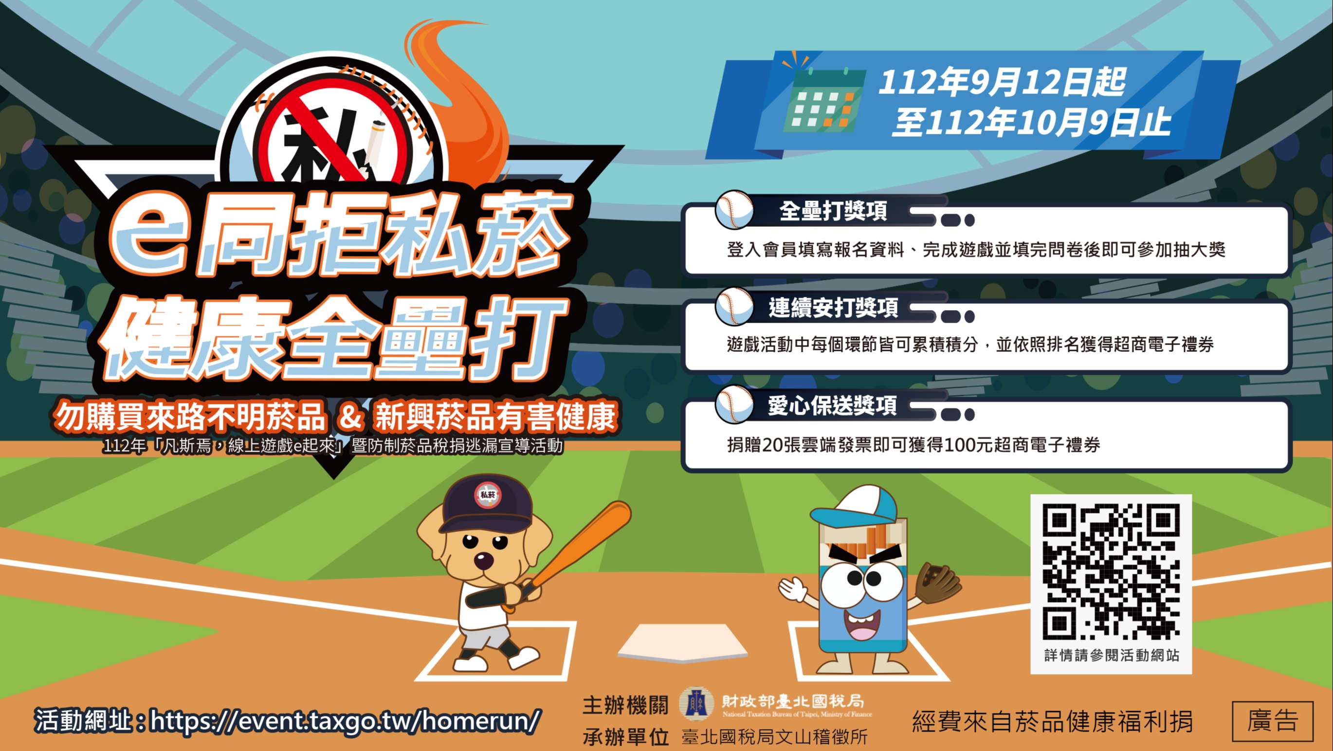 財政部臺北國稅局112年「凡斯焉,線上遊戲e起來」 暨防制菸品稅捐逃漏之宣導活動,詳如附件。
