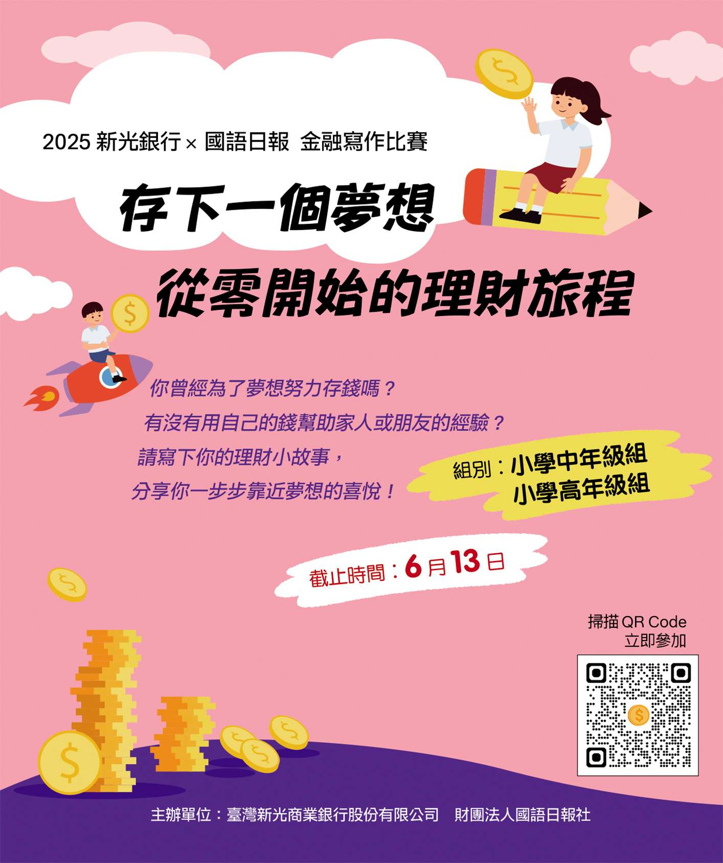 國語日報徵文活動(一)徵稿日期:即日起至114年6月13日止(二)徵稿主題:「存下一個夢想 從零開始的理財旅程」