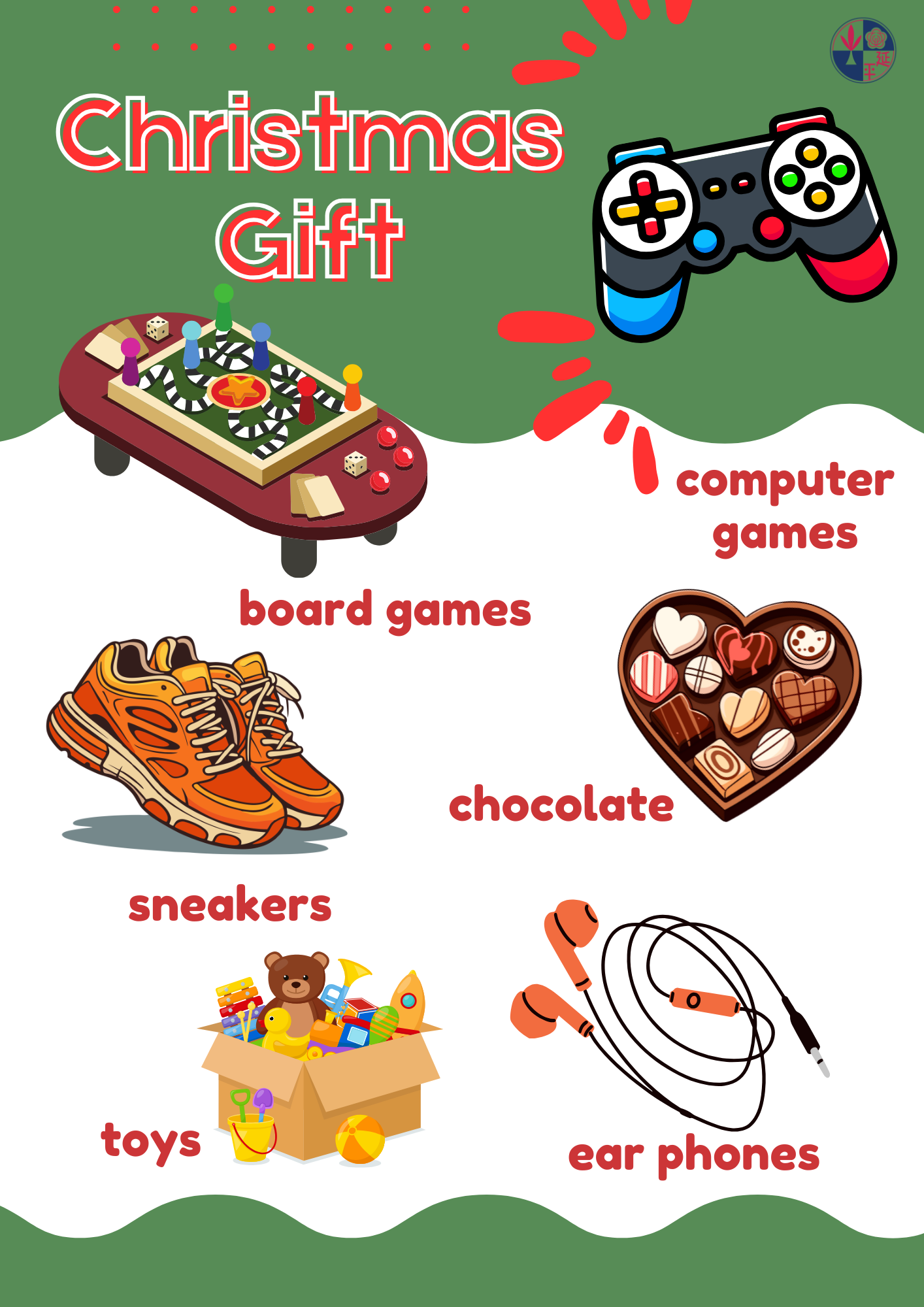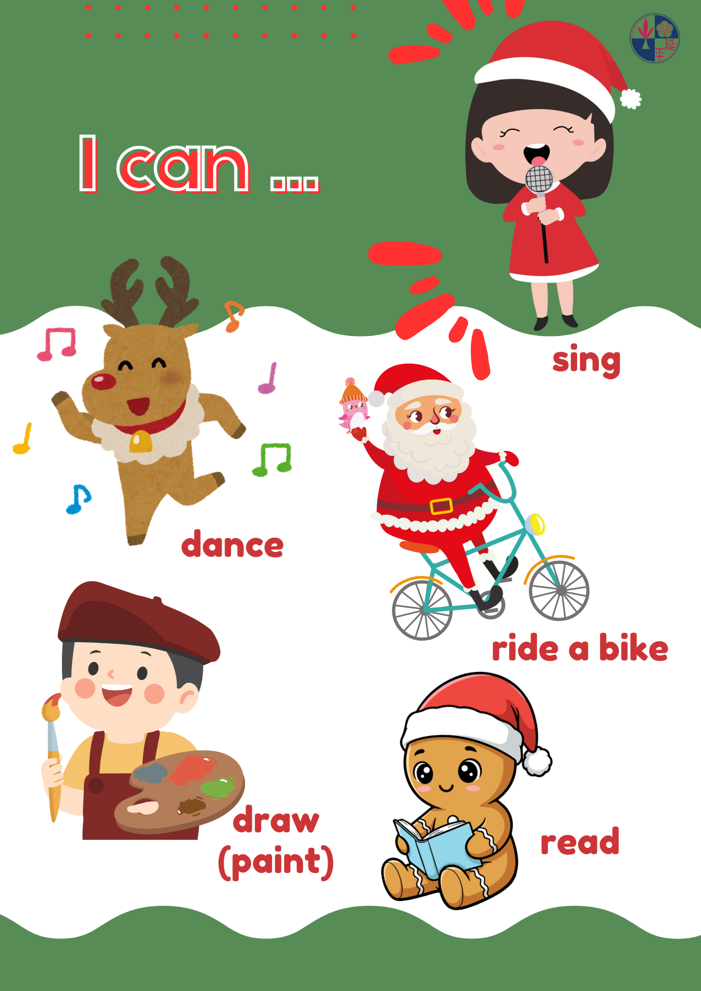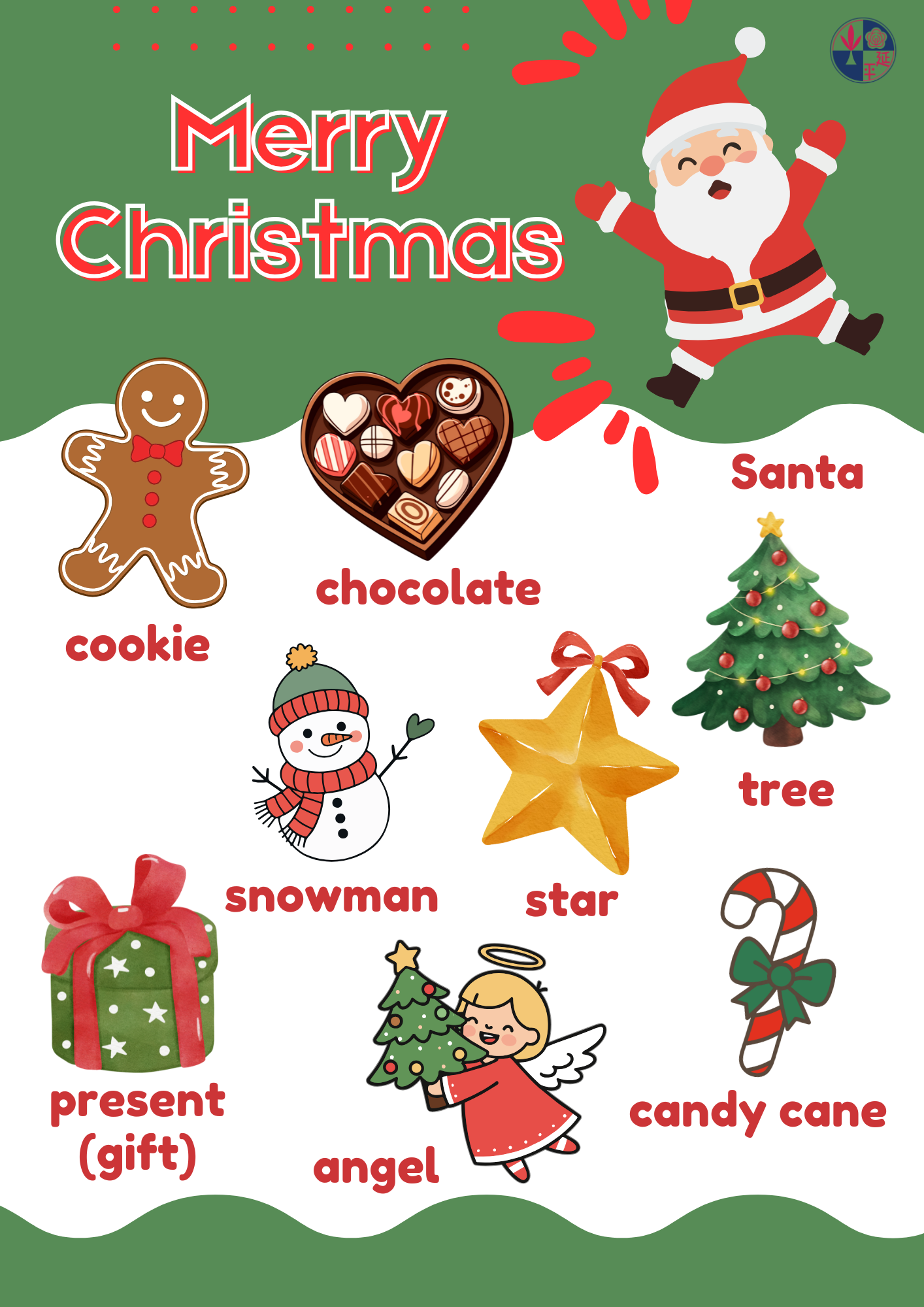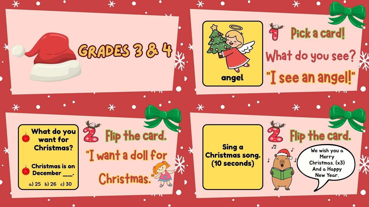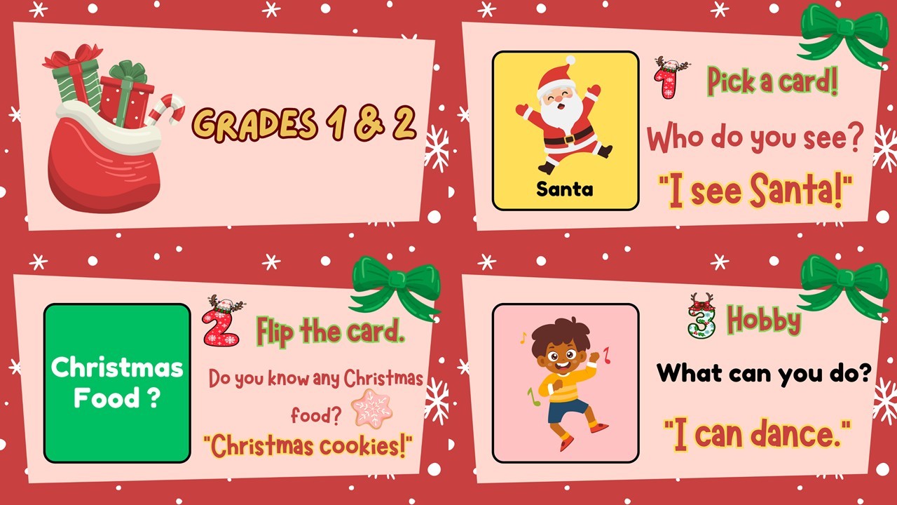 低年級:抽卡片,說出上面的「聖誕節」單字,再翻到背面,回答卡片上的問題,題目共有3組(聖誕食物、聖誕顏色和我會…),隨機出現。