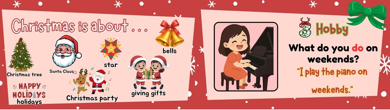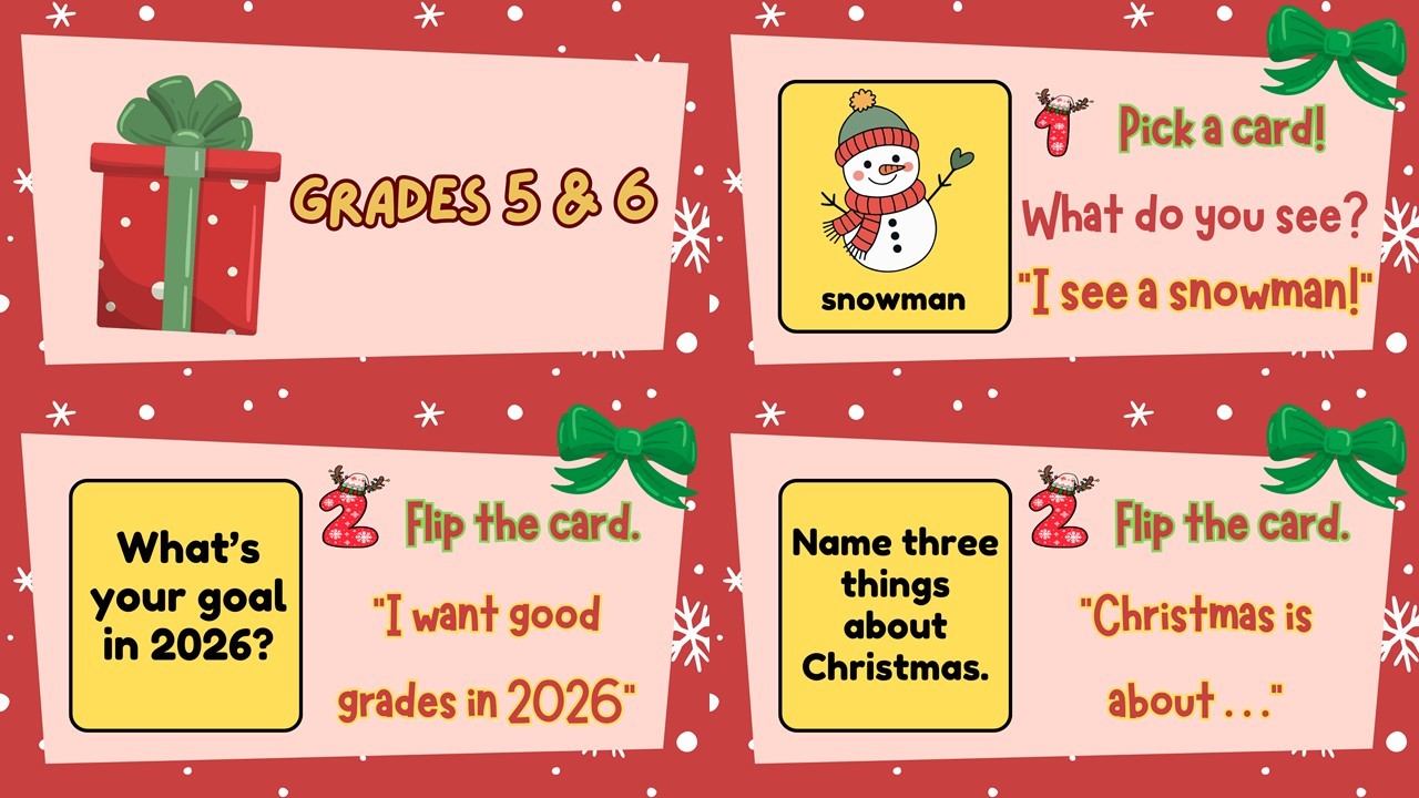 高年級:抽卡片,說出上面的「聖誕節」單字,再翻到背面,回答卡片上的問題,題目共有3組(新年目標、關於聖誕節和周末休閒活動),隨機出現。