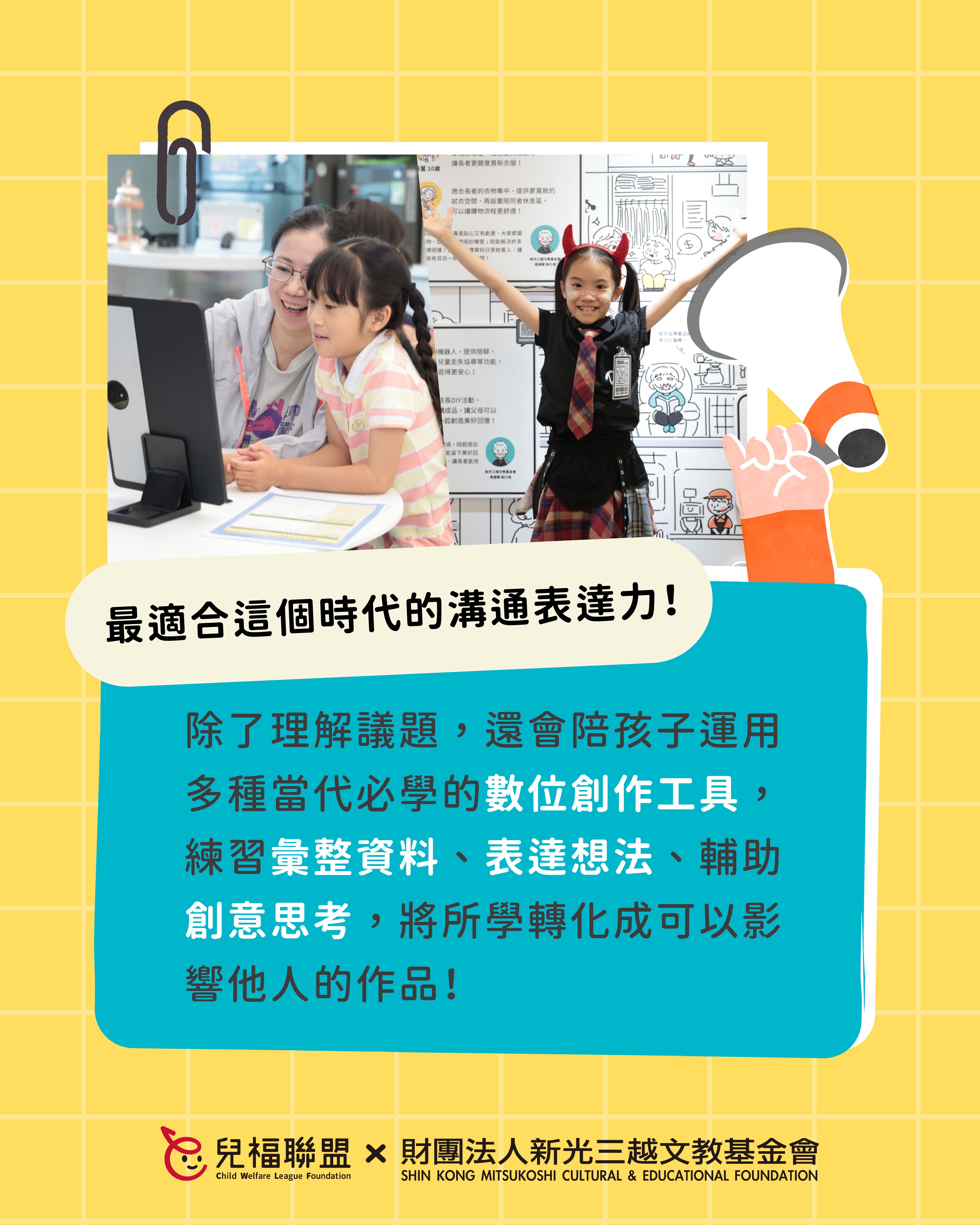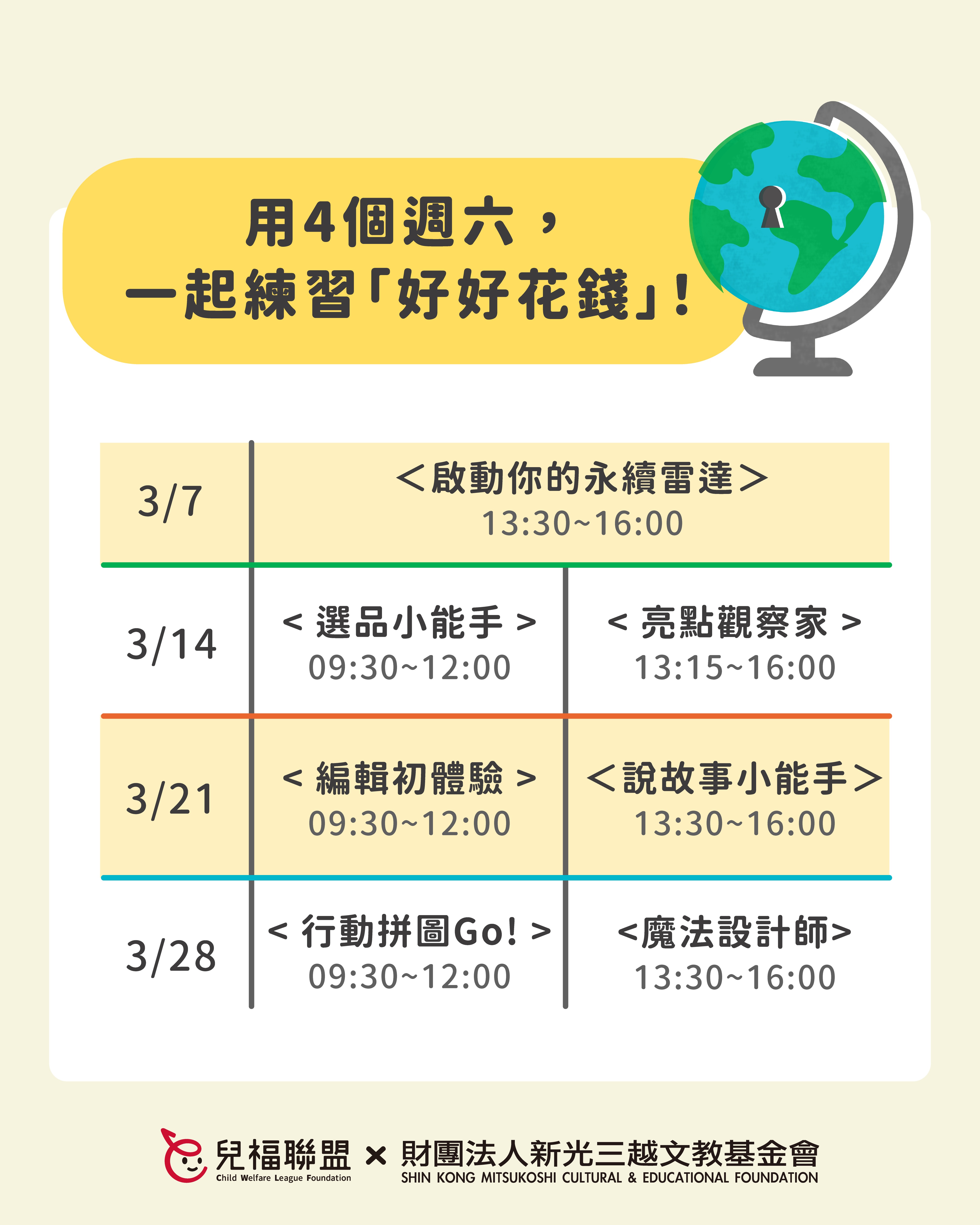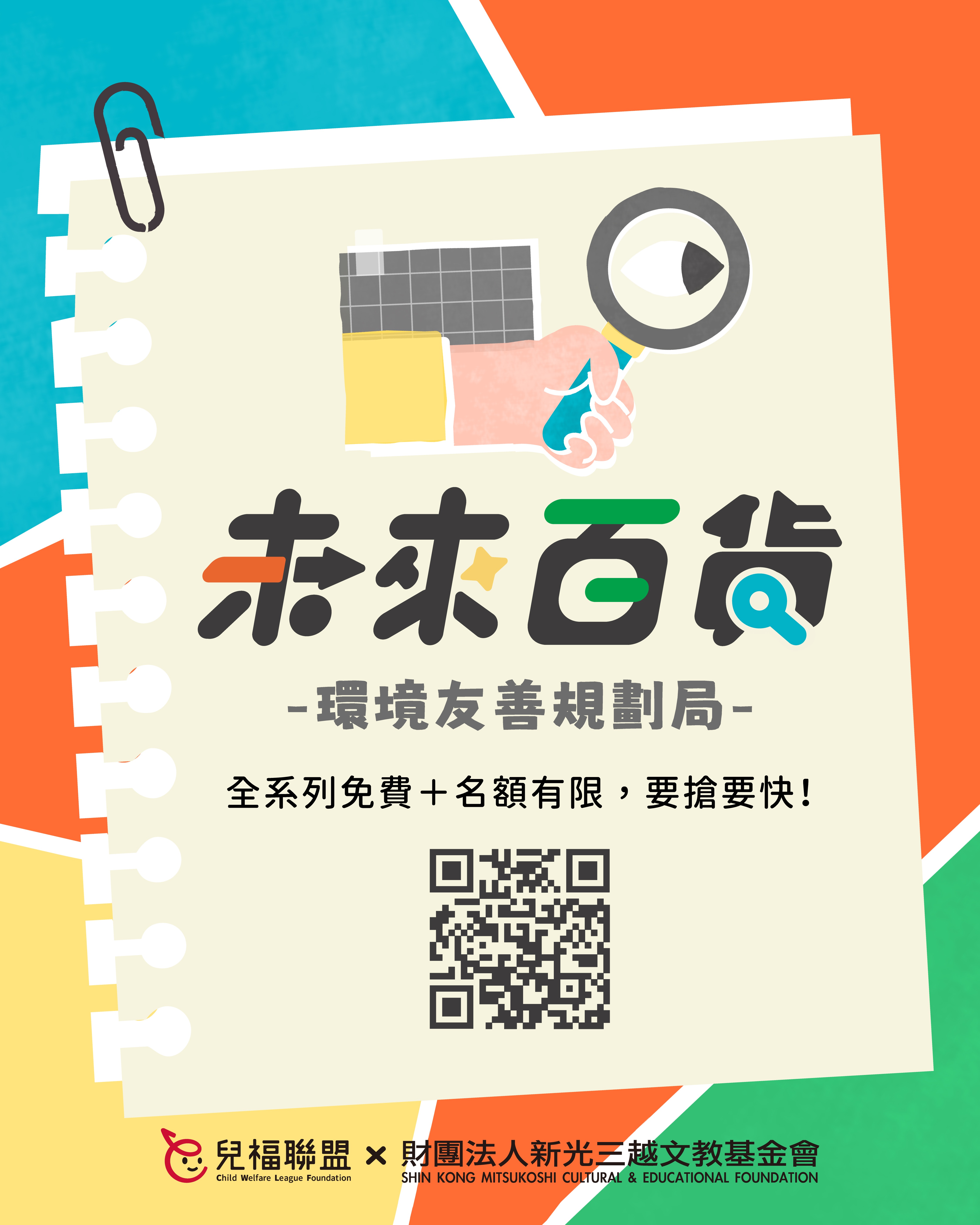 一、為培養學童面對未來社會的獨立思考、溝通表達、永續素養等能力,並促進親子共學機會,本會辦理「新人類時光機:未來百貨-環境友善規劃局」系列課程,透過貼近生活、以遊戲和體驗為主的學習設計,引導孩子理解責任消費、環境保護等永續議題,練習整理觀點並付諸行動,以家庭、自身的生活為起點,為社會帶來良善的改變!